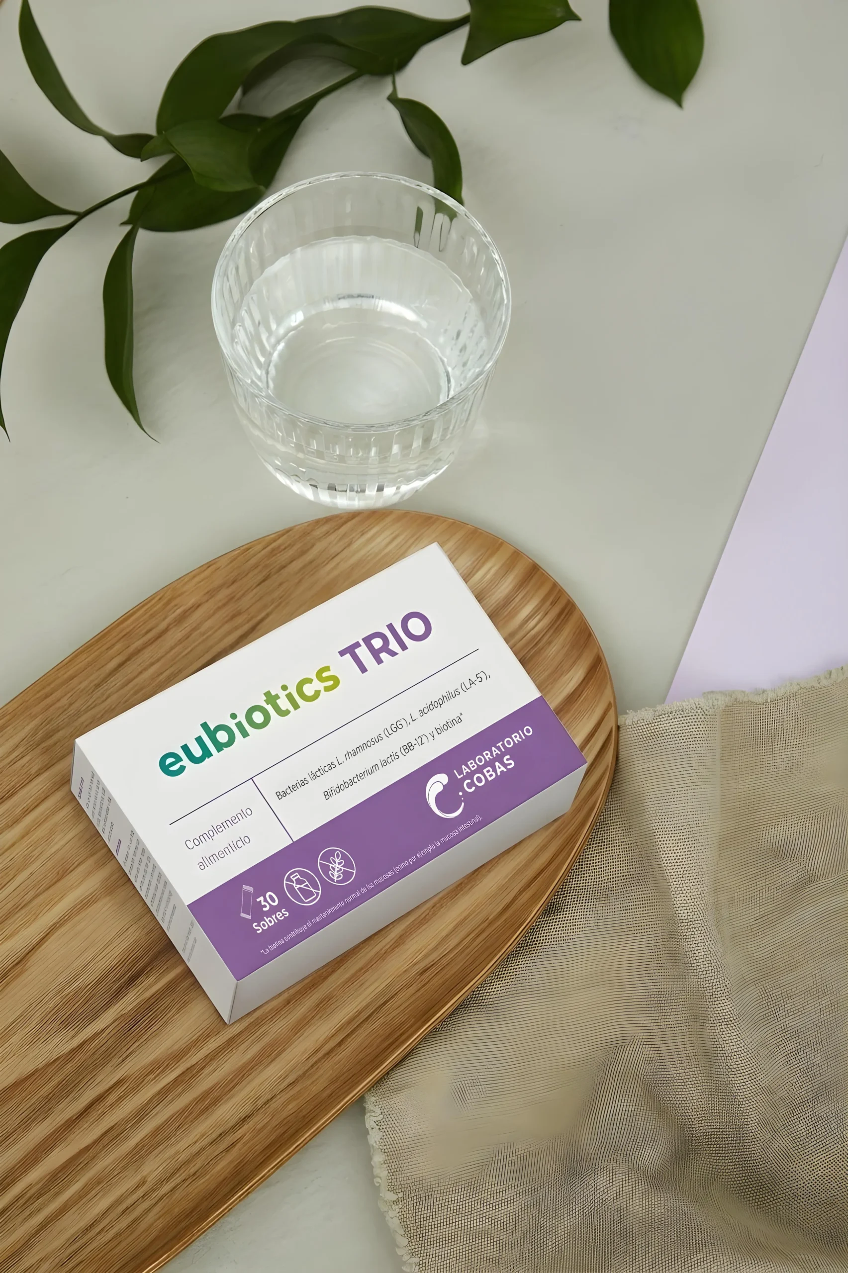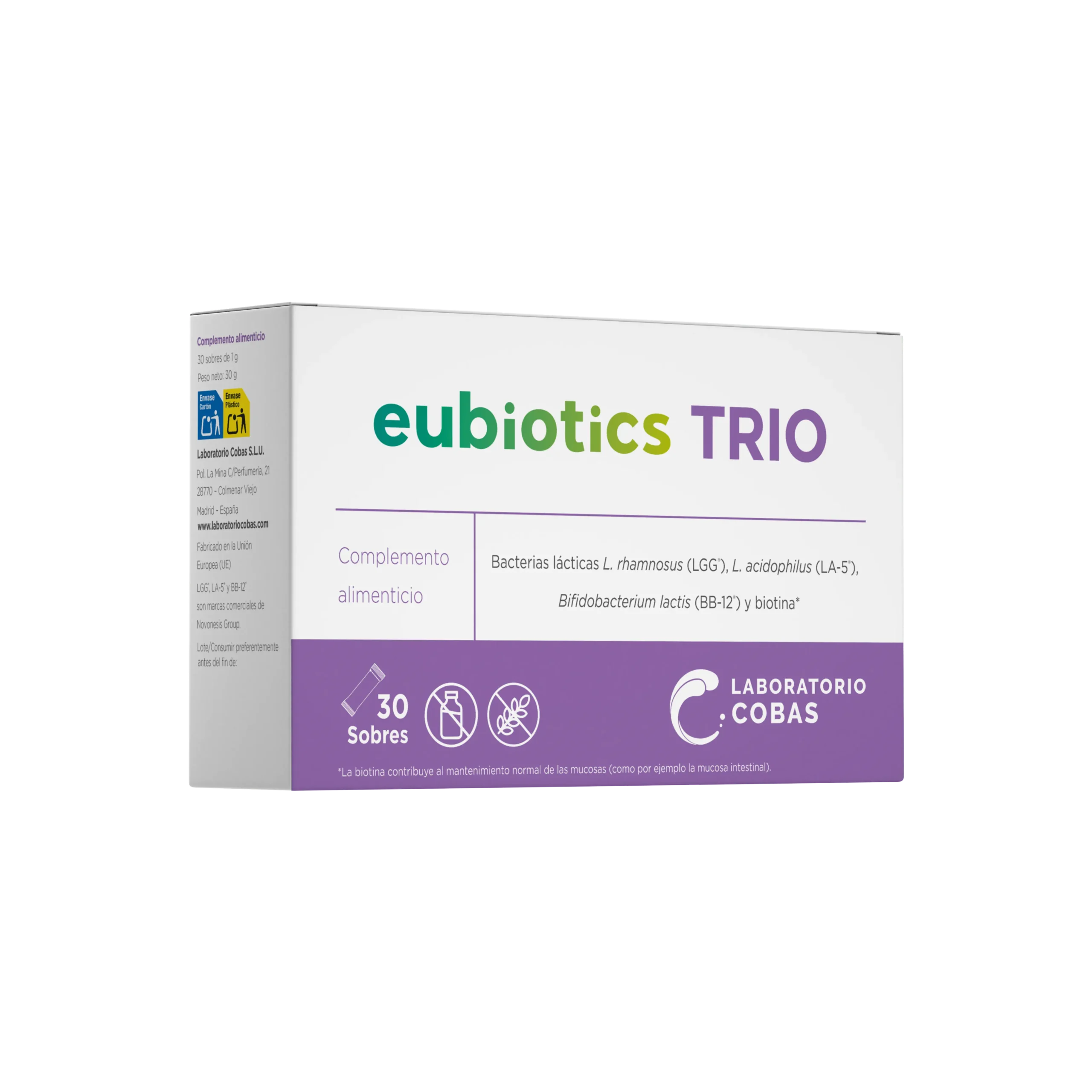 eubiotics® TRIO es una fórmula probiótica avanzada que combina Lacticaseibacillus rhamnosus GG (LGG®), Lactobacillus acidophilus LA-5® y Bifidobacterium animalis subsp. lactis BB-12®, junto con biotina, para ayudar a restaurar el equilibrio de la microbiota intestinal y mejorar la salud digestiva.